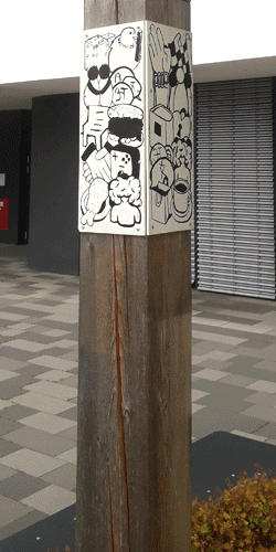 Drei Entwürfe pro Schüler:in wurden im Skizzenbuch verfeinert und auf Postkarten mit Tusche und Pinsel trainiert, um sie dann auf weiß lakierte Holzplatten zu tuschen.